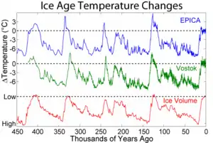 يظهر نمط التغييرات في درجات الحرارة وحجم الجليد المرتبط مع الفترات الجليدية وما بين الجليديين الحالية