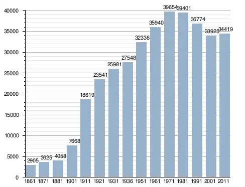 في سنة 1861 بلغ عدد السكان 2٬905 نسمة، وتطور العدد ليصل في سنة 2011 لـ 34٬419 نسمة.