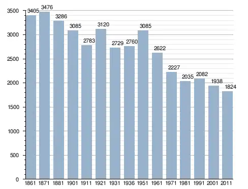 في سنة 1861 بلغ عدد السكان 3٬405 نسمة، وتطور العدد ليصل في سنة 2011 لـ 1٬824 نسمة.