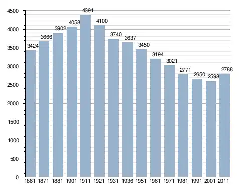 في سنة 1861 بلغ عدد السكان 3٬424 نسمة، وتطور العدد ليصل في سنة 2011 لـ 2٬788 نسمة.