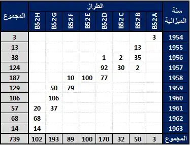 | الطراز | Y/XB-52 | B-52A | B-52B | B-52C | B-52D | B-52E | B-52F | B-52G | B-52H |