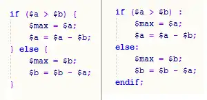 كانت PHP/FI وقتها تحوي على بعض الوظائف المتوفرة بالإصدارات الحالية من اللغة، كما أن المتغيرات كانت تشبه متغيرات بيرل، وكانت تركيبها النحوي يشبه بيرل بالرغم من بساطتها ومحدودياتها.