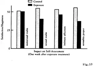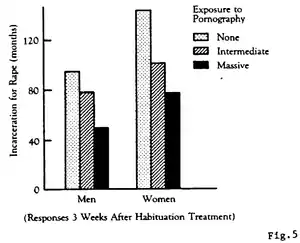 الآثار لفترات طويلة الاستهلاك من الإباحية أفادت بإجراء استعراض للدراسات الخاضعة للرقابة التي وجدت أن العرض واسعة من النوع المواد الإباحية التي تباع عادة في محلات بيع الكتب الكبار وكان ارتباطاً إيجابيا بالتساهل في الحكم على شخص أدين بالاغتصاب في إطار محاكمة صورية (الشكل 5)، انخفض رضا المشاركين مع حياتهم الجنسية والشركاء (الشكل 10)، ورغبة ذاتية التبليغ متزايدة لارتكاب الاغتصاب أو أخرى أجبرت الأفعال الجنسية (الشكل 12).[4] آثار المواد الإباحية: "منظور الدولي" التصدي لهذا، محتجة بأن آثار التعرض قد تكون مختلفة عند فرد يتحكم بهم التعرض من عندما يتعرضون للتعرض تجريبيا: