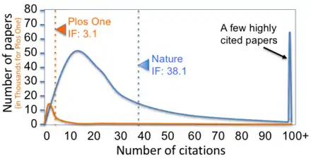 مجلة تأثير العوامل (JIFs) هي قياس متوسط عدد الاستشهادات التي المقالات التي نشرتها مجلة في العامين الماضيين تلقت في العام الحالي. ومع ذلك والمجلات عالية جدا تأثير العوامل غالبا ما تكون على أساس عدد صغير جدا جدا استشهد الأوراق. على سبيل المثال، معظم الصحف في الطبيعة (عامل التأثير 38.1, 2016) "فقط" استشهد 10 أو 20 مرة خلال السنة المرجعية (انظر الشكل). المجلات مع "منخفض" أثر (مثل بلوس واحد ، أثر عامل 3.1) بنشر العديد من الأوراق التي استشهد من 0 إلى 5 مرات ولكن عدد قليل للغاية استشهد المواد.
