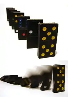 (في الأعلى) قطع الدومينو واقفة، (في الأسفل) قطع الدومينو في حالة حركة