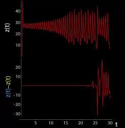 تأثير الفراشة في جذب لورينتز الزمن 0 ≤ t ≤ 30 (أكبر) الإحداثيz (أكبر)