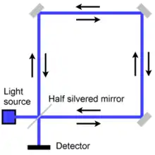 بالمثل، فإن الضوء المنتقل بالاتجاه المعاكس للدوران سوف يقطع أقل من محيط الحلقة قبل الاصطدام بمصدر الضوء من الأمام. يكون الزمن لهذا الاتجاه حتى يصل إلى المصدر الضوئي بالتالي: