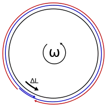 يمكن عرض الإزاحة في تداخل الأهداب ببساطة كنتيجة لاختلاف المسافات التي يقطعها الضوء بسبب دوران المراقب النسبي. إن أبسط اشتقاق يمكن أن يكون لحلقة دائرية بسرعة زاوية ، ولكن النتيجة عامة للأشكال الحلقية الهندسية الأخرى. ينبعث ضوء من مصدر ضوئي في كلا الاتجاهين من نقطة على الحلقة الدوارة، ويتحتم على الضوء المنتقل باتجاه الدوران أن يجتاز طولاً أكبر من محيط الحلقة وبالتالي يصطدم بمصدر الضوء الأصلي من الخلف بعد زمن قدره