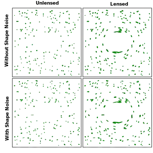 لقياس تأثيرات المحاذاة هذه من الضروري قياس تفلطح المجرات الواقعة في الخلفية وتكوين تخمينات إحصائية لإتجاهات محاذاتهم، تكمن المشكلة الأساسية في أن المجرات ليست بالأصل دائرية بشكل مثالي إنما التفلطح المقاس سيكون ناتج تراكب تفلطحها الأصلي مع تأثير إنحناء القص في تأثير عدسات الجاذبية، غالباً ما يكون عامل التفلطح الحقيقي أكبر بكثير من التفلطح الناتج عن الإنحناء (بحوالي 3-300، إعتماداً على الكتلة المولدة لتأثير العدسة)، لهذا عادة ما يتم أخذ معدل العديد من قياسات المجرات التي تقع في الخلفية للتقليل من "ضوضاء الشكل؛Shape Noise"، وأيضاً إتجاهات المجرات يجب أن تكون مرتبة بعشوائية [1] لهذا يمكن الإفتراض بأن أي محاذاة منتظمة في إتجاهات عدد من المجرات يدل على وجود عدسة جاذبية أمامها.