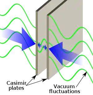 عند دراسة تأثيرالمجالات من الناحية الكلاسيكية يفترض عدم وجود أي قوى بين اللوحين يمكن قياسها (لانعدام وجود مجال خارجي). لكن من ناحية كهروديناميكا الكم فأننا نجد أن اللوحين يتأثران بقوى الفوتونات الافتراضية التي تؤسس المجال خارج اللوحين ، وتغلّبها على عدد قليل من الفوتونات الافتراضية المحصورة بين اللوحين فيتجاذبان (عدد الفوتونات الافتراضية بين اللوحين يكون قليلا نظرا لشرط أن تكون الفوتونات الافتراضية ذات أطوال موجة مناسبة بالنسبة للمسافة القصيرة بين اللوحين). إذا كانت اللوحتان مسطحتان ينشأ ضغطا عليهما من الخارج على الداخل ، يسمى "قوة كازيمير" وقدرها: