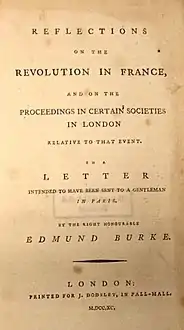 - Burke, Edmund (1790). Reflections on the Revolution in France, And on the Proceedings in Certain Societies in London Relative to that Event. In a Letter Intended to Have Been Sent to a Gentleman in Paris (الطبعة 1). London: J.Dodsley in Pall Mall. مؤرشف من الأصل في 29 ديسمبر 2018. اطلع عليه بتاريخ 01 يوليو 2015. الوسيط