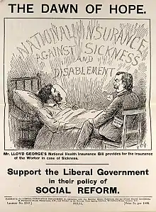 بحُلول أواخر القرن التاسع عشر، أخذت الحُكومات الأوروپيَّة تُطلق برامجًا تأمينيَّة وطنيَّة ضدَّ المرض والعجز، وكانت ألمانيا من الدُول الرائدة في هذا المجال، إذ كانت قد شرعت في تطبيق مشاريع خيريَّة في كُلٍّ من بروسيا وسكسونيا مُنذُ عقد الأربعينيَّات من القرن سالِف الذِكر، وخلال عقد الثمانينيَّات منه أدخل المُستشار أوتو ڤون بسمارك نظام معاشات العجزة، والتأمين ضدَّ الحوادث، والرِعاية الطبيَّة، فشكَّلت هذه الأُسس التي نمت عليها ألمانيا كدولةٍ رفاهيَّة.[ْ 15][ْ 16] وفي بريطانيا شُرِّعت عدَّة قوانين وأنظمة على نحوٍ أوسع خِلال عهد الحُكومة الليبراليَّة سنة 1911م، ومن أبرزها قانون التأمين الوطني الذي منح الطبقة الكادحة البريطانيَّة أوَّل نظامٍ تأمينيٍّ مُساهمٍ ضدَّ المرض والبطالة.[ْ 17] وسِّعَ هذا النظام على نحو مُكثَّفٍ بعد الحرب العالميَّة الثانية بفضل تقرير بڤريدج، لِتدخل البلاد بفضله في عداد دُول الرفاهيَّة.[ْ 18]