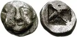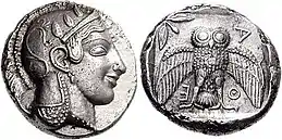 | أوبل فضية من عصر شعارات النبالة، طُبعت في عصر بيسيستراتوس من 545-525 ق.م | |