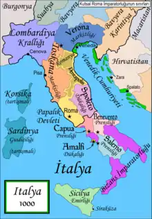 وحتى عام 774 ظلت زمام الامور بأيدى اللولمبارديون -الشعب الأماني- القاطن بشمال إيطاليا. وفي عام 751 خاض اللولمبارديون حروبًا في الجنوب وسيطروا على رافينيا[21] وآرادوا دعمًا من البابا بالفرنجة. ولكن هزمت الفرنك اللومبارديون، وعادت إيطاليا إلى البابا مرة اخرى. وبالتالي تأسست دولة بابوية مستقلة عن مدينة روما. وردًا على ذلك، قام البابا الثالث ليو باسترداد كرامة ومكانة الفرنك، وذلك باعلان الإمبراطور شارلمان ملك عليها[22] امّا في القرن الحادي عشر، قويت الدولة بضم العديد من الدول مثل: جمهورية البندقية، جمهورية جنوة، اتحاد لومبارد، مملكة نابولي، وجمهورية فلورنسا. وفي ذلك الوقت كانت البابوية والامبراطورية الرومانية المقدسة من أهم مراكز القوة في العالم. واندلعت العديد من المشادات والخلافات بين انصار كل قوى منهما في دول المدن بإيطاليا. وعرفت هاتين المجموعتين باسم الغويلفيون والغيبلينيون[23]