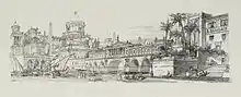 وكان عند ميناء طبيعي قرب قرية الصيادين براقودة بني الإسكندر ميناء محصنا أشبه بالقلعة شرق الميناء الشرقي حاليا عند منطقة السلسلة. وقد قام بتوصيل جزيرة فاروس المقام عليها قلعة قايتباي حاليا بالبر بجسر هيبتاستديون وكان طوله 1300 متر. وبهذا أقام مينائين لمدينته علاوة علي الفنار ليرشد السفن ليلا ونهارا من فوق جزيرة فاروس. وكان الحي الملكي قرب الإبراهيمية ومصطفي كامل وشمالهما. وكان بالمدينة معبد السرابيوم لعبادة الإله سيرابيس وهو بالمنطقة بين باب سدرة وكوم الشقافة وبجواره معبد الإله مترا الإغريقي وقد تهدم المعبد أيام الرومان. وفوق تل سدرة يوجد عمود السواري (بومبي) وتمثال فرعوني جرانيتي كبير وخلفه تماثيل الآلهات لحمايته. ويسار العمود يوجد جعران عليه كتابة هيروغليفية وفوق التل يوجد ثلاث تماثيل لأبو الهول اثنان إغريقيان يمثلان بطليموس السادس والثالث فرعوني بلا رأس ويوجد أجزاء من تماثيل رمسيس الثاني وبسماتيك وقد جلبت من هيليوبوليس. كما يوجد مقياس للنيل لقياس منسوب مياه ترعة المحمودية حاليا و12 خزان لحفظ مياه الفيضان وحمامات أثرية.