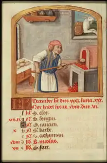 من أجل الحصول على الخبز كان يقوم الزبائن بتقديم بشكل مسبق الدقيق لإعداده. لم يتم إدخال مطاحن الرياح في أوروبا حتى الحملة الصليبية الأولى، وكان استخدامها يسهل عملية إعداد الخبز ويجعله أكبر حجماً. إذا قام أحدهم بتقديم خمسة أرطال من الدقيق فإن الخباز عليه أن يعطيه ثلاثة أرطال من الخبز.[32] كان الخباز يستطيع أن يعطي الخبز للزبون الفقير الذي لا يملك الدقيق من أجل إعداد الخبز ثم يطالبه لاحقاً بذلك الدقيق، فلقد كان الخباز هو أكثر الأشخاص الذين كانوا يعطون الأفراد القروض. ولقد ظهرت أهمية الخبز في الوثيقة العظمى المكتوبة عام 1215. في بعض الأحيان كان من الممكن إيجاد في الحوائط الخارجية للكنائس الرسومات التوضيحية لشكل وحجم الخبز من أجل تجنب غش الخبازين للزبائن.[33] في عام 1039 ظهر في بعض بلدان أوروبا مرض تسمم الأرغوتي بسبب احتواء دقيق الشوفان على الأرغوت والذي كان يؤدي إلى ظهور الهلوسة والهذيان مما أدى إلى ظهور أولى علامات التسمم الغذائي. ولقد تم ظهور أولى مطاحن الرياح في قرية في انجلترا.
