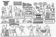 واليوم يمكن معرفة طريقة إعداد الخبز خلال فترة ما قبل الدولة المصرية وما بعد ذلك بفضل وجود اللغة الهيرغليفية والتماثيل القادمة من آشور حيث تتواجد العمليات المختلفة لجمع وطحن الحبوب،[13] ولقد أعطى المصريون أهمية كبيرة لعملية جمع الحبوب نظراً لوجود ثلاثة أقسام للتقويم السنوي: أخيت (الفيضانات) وبيريت (الزراعة) وشيمو (الجمع). إن تفاني المصريين القدماء في إعداد الخبز جعلهم يُلقبون "بأكلة الخبز". في بعض الأحيان كان الخبز يُعتبر أكثر من مجرد غذاء؛ فكان المزارعون يحصلون على مرتباتهم في صورة عدد معين من أرغفة الخبز والجعة (ثلاث أرغفة وإبريقين من الجعة). وتشير بعض الشواهد أن المزارعين أثناء فترة حكم رمسيس التاسع كانوا يثورون في حالة الدفع لهم بشيء غير الخبز. وكانت الطبقات الأكثر فقراً تأكل الخبز فقط.
