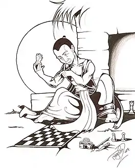- في أحد الأيام وصل سفير من الهند إلى البلاط الفارسي للملك كسرى الأول وبعد تبادل التحية والاحترام قدّم السفير هدايا ثمينة من ملكه كان من بينها رقعة جميلة مع قطع منحوتة من العاج وخشب الأبنوس تثير الفضول وبعدها أعلن تحديا: