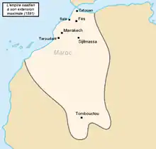 مع ظهور سلالة السعديين المغربية، أصبح الصاعد المغربي نشط في الصحراء الغربية. في الجنوب، تقدم إلى غاية تمبكتو والسنغال. في معركة تونديبي سنة 1591، انتصرت قوات أحمد المنصور السعدي التي قادها جؤذر باشا، انتصارا حاسما على إمبراطورية صنغاي التي خضع لها الطوارق ودفعوا لها الجزية. لم تدم ذروة السلطة المغربية، فبعد وفاة المنصور في 1603، تمزق المغرب إلى إقطاعيات على أثر تنازع أبناء المنصور الملك. في هذه الأثناء أقام الأوروبيون جيوب جديدة في الشمال.[20] حوالي 1632، أعلنت كل من تمبكتو وجاو استقلالهم واستعادا السيطرة على الصحراء.[21]