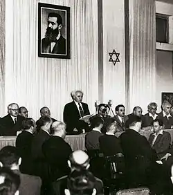 في 14 مايو، 1948، يوم واحد قبل انتهاء صلاحية الانتداب البريطاني، أعلن بن غرويون "إنشاء دولة يهودية في أرض إسرائيل، ستعرف بالمستقبل بإسم دولة إسرائيل"، وقال أن الفضل للتصريح عاد إلى "حقنا الطبيعي والتاريخي وقوة قرار الجمعية العامة للأمم المتحدة". جزم التصريح أن ولاية إسرائيل "ستضمن المساواة الكاملة للحقوق الاجتماعية والسياسية لجميع سكانها بغض النظر عن الدين، العرق أو الجنس; ستضمن حرية الدين، الضمير، اللغة، التعليم، والثقافة; ستحمي الأماكن المقدسة لجميع الأديان; وستكون وفية لمبادئ ميثاق الأمم المتحدة".[46]