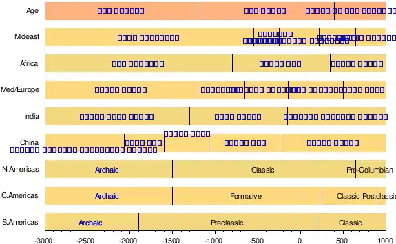 - Regions not included in the timeline include: Southern أفريقيا جنوب الصحراء, the تاريخ الكاريبي, تاريخ آسيا الوسطى, Northern أوروبا في العصر البرونزي,
