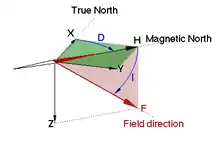 في موقع معين، يتطلب التمثيل الكامل للمجال المغناطيسي للأرض متجها به ثلاثه إحداثيات (انظر الشكل). ويمكن ان تكون هذه ديكارتية (الشمال والشرق والأسفل) أو كرويه (الانحدار والميل والكثافة). وفي النظام الأخير، يجب قياس الانحراف عن الشمال الحقيقي، والزاوية الافقيه، أولا لتحديد اتجاه الشمال المغنطيسي ؛ ثم تراجع (زاوية عموديه) يمكن قياس نسبه إلى الشمال المغناطيسي. في الصين، تم قياس الاتجاه الأفقي في وقت مبكر من القرن الرابع قبل الميلاد، ووجود الانحراف المعترف بها لأول مره في 1088. في أوروبا، لم يكن هذا مقبولا علي نطاق واسع حتى منتصف القرن الخامس عشر الميلادي. الميل (المعروف أيضا باسم التراجع المغناطيسي) تم قياسه لأول مره في 1544 ميلادي. لم يقاس الكثافة حتى 1791 ، بعد التقدم في فهم الكهرومغناطيسية
