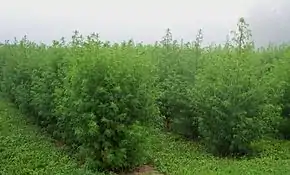 الشيح الحولي يزرع كمحصول حقلي في فيرجينيا الغربية لأجل انتاج الأرتيميسينين, 2005الأرتيميسينين هو لاكتون ذو تربين أحادي ونصف مشتمل على مجموعة البيروكسيد والتي يعتقد أنها هامة لأجل نشاطها ضذ الملاريا. مشتقاته، أرتيسونات وأرتيميثر، تم استخدامهم في العيادات منذ عام 1987 لعلاج الملاريا المقاومة والحساسة للدواء وخاصةً الملاريا الدماغية. تتسم هذه الثلاثة أدوية بالعمل السريع والكفاءة العالية والتحمل الجيد. فيقومون بقتل الأشكال اللاجنسية للمتصورة بيرغي (P. berghei) والمُتَصَوِّرَةُ القُرْدُوحِيَّة كما أن لديه نشاط مانع للنقل.[115] في عام 1985, تشو يشنغ (Zhou Yiqing) وفريقه جمعوا الأرتيميثر واللوميفانترين في حبة واحدة، والذي تم تسجيله كعلاج في الصين عام 1992. عرف بعد ذلك ب "كوارتم".[116] تستخدم علاجات الأرتيميسينين المركبة (ACTs) الآن عالمياً لمعالجة الملاريا المنجلية الغير مصحوبة بمضاعفات، ولكن الوصول لذلك الدواء مازال محدوداً في معظم الدول الموبوءة بالملاريا وقلة قليلة فقط من المرضى، الذين هم في حاجة إلى الأدوية المعتمدة على الأرتيميسينين، يمكنهم الحصول عليه.[117]