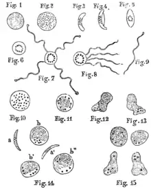 عام 1880, لاحظ شارل لويس ألفونس لافران طفيليات ذات صبغة وكذلك التسوط الخارجي للخلية المشيجة الذكرية.[56]السبب: التعرف على المتصورة والأنوفيلس