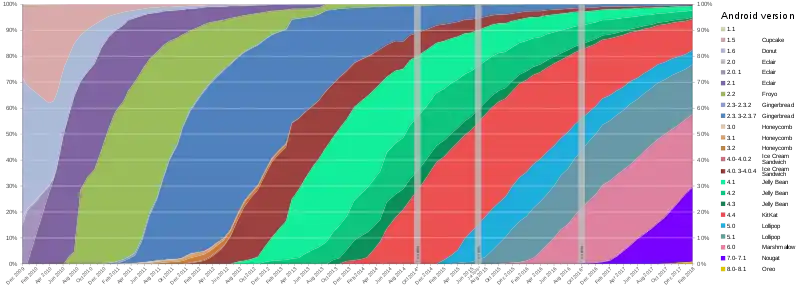 توزيع الإصدارات منذ ديسمبر 2009، إلى يونيو 2017. اعتبارا من فبراير 2018، أندرويد نوغة هو النسخة الأكثر استخداما على نطاق واسع من الأندرويد، تعمل على 28.5٪ من جميع أجهزة الأندرويد، في حين أندرويد لوليبوب يعمل على 24.6٪ من الأجهزة (82.3٪ منه أو أحدث)