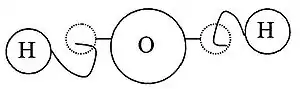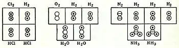 وبناءً على ذلك، قدّم لويس في مقالته الشهيرة «الذرة والجزيء» التي كتبها سنة 1916 م «بنية لويس» التي مثّل فيها الذرات والجزيئات، حيث استخدم النقاط للإشارة إلى الإلكترونات، والخطوط للإشارة إلى الروابط التساهمية، وهو المصطلح الذي صاغه لويس في تلك المقالة للإشارة إلى الرابطة التي تنتج من تشارك ذرتين لإلكترون وحتى ستة إلكترونات لتكوين الروابط أحادية الإلكترون والفردية والمزدوجة والثلاثية.[27] وعلى حد تعبير لويس: «قد يُشكّل الإلكترون جزء من غلاف ذرتين مختلفتين دون القول بأنه ينتمي لأحدهما دون الأخرى». بالإضافة إلى ذلك، افترض لويس أن الذرة تميل إلى اكتساب أو فقد عدد من الإلكترونات لتُكمل المكعب. لذا، فقد استخدم لويس في بنيواته الرموز الكيميائية للذرات لتوضيح بنية الجزيء. كما استخدم الخطوط للتوصيل بين الذرات المترابطة مع بعضها البعض؛ وأحيانًا، استخدم أزواج من النقاط بدلاً من الخطوط. تم تمثيل الإلكترونات الزائدة التي تشكل أزواجًا وحيدة بزوج من النقاط، توضع بجوار ذراتها (كما بالرسم). ولتلخيص آرائه حول نموذجه الجديد لترابط الذرات، قال لويس: «قد تتوافق ذرتان مع قاعدة الثمانيات، ليس فقط عن طريق نقل الإلكترونات من ذرة واحدة إلى أخرى، ولكن أيضًا من خلال تبادل زوج أو أكثر من الألكترونات... بالتالي يقترن زوج من الإلكترونات معًا، عندما يقعان بين مركزي ذرتين، ويبقيا مترابطان في غلاف الذرتين، وهو ما اعتبرته رابطة كيميائية. وبالتالي لدينا صورة ملموسة من هذا الكيان المادي، هذا هو "الخطاف والعين" التي هي جزء من عقيدة الكيمياء العضوية.[28]»