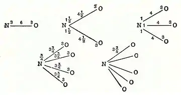 في سنة 1803 م، اتخذ جون دالتون من وزن ذرة الهيدروجين (أخف العناصر الكيميائية) كوحدة معيارية، واستخلص مثلاً أن ثلاثي أكسيد ثنائي النتروجين نسبة عناصره هي 2 إلى 3، فأعطاها الصيغة الكيميائية N2O3. ولكنه أخطأ عندما تخيّل أن الذرات متماسكة بخطاطيف لتكوين الجزيئات. لاحقًا في سنة 1808 م، نشر الرسم التوضيحي الشهير حول اتحاد العناصر.