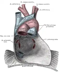 ![]() الجدار الخلفي للكيس التاموري تظهر خطوط انعكاس (التواء) التامور المصلي على الأوعية الكبيرة الجدار الخلفي للكيس التاموري تظهر خطوط انعكاس (التواء) التامور المصلي على الأوعية الكبيرة | |