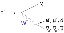 يتحلل التاوون τ بعد نشأته سريعا جدا جدا ، وهو يتحلل بصفة ريئسية إلى لبتونات خفيفة طبقا للمعادلتين :