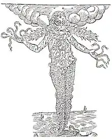 وصفه أبولودورس بأنّه وحشٌ ضخم مجنّح، يطول رأسه النجوم، بشكلٍ آدمي فوق الخصر، وتلفّ القسم السفلي من جسمه الأفاعي، وله عينان تطلقان النيران.[9]