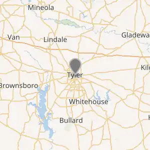 مدينة تايلر في شرق تكساس, 160 كم شرق من مدينة دالاس. هناك مدن صغيرة بجانب تايلر، بما فيها وايتهوس، لندايل, و شابل هيل.