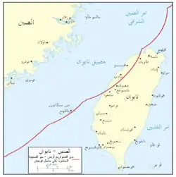 تايوان هي عبارة عن جزيرة تقع في جنوب شرقي آسيا، في المحيط الهادئ ويفصلها عن الصين مضيق فورموزا ولا تتجاوز المسافة بينها وبين الصين 140 كيلومترا، وتتكون تايوان من جزيرة فورموزا وعدد آخر من الجزر الصغيرة أبرزها: البيسكادورس، كيموي، مانسوا، بزاناس. ومساحة تايوان 36962 كيلومترا، ويمر بوسطها مدار السرطان، والجزيرة مستطيلة الشكل، طولها من الشمال والجنوب وعرضها بين الشرق والغرب، وتشكل المرتفعات نصف مساحتها تقريبا، وتتركز في الجانب الشرقي، وتنحدر أرضـــها إلى تلال ثم سهول في الغرب، وانهارها صغيرة سـريعة الجريان ومعظمها يتجه إلى الغرب.[65]