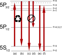 الليزر اللازمة الضوئية الممغنطة محاصرة من الروبيديوم 85: (أ) & (ب) الاستيعاب (الأحمر detuned إلى خط منقط) و عفوية الانبعاثات دورة (ج) و (د) يحظر التحولات ، (e) يدل على أنه إذا كان تبريد الليزر يثير ذرة إلى F=3 الدولة ، فإنه يسمح تسوس إلى "الظلام" أقل فائق الدقة, F=2 الدولة ، والتي من شأنها أن توقف عملية التبريد ، إذا لم يكن repumper الليزر (f).