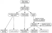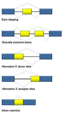 - قائم على العد (أيضًا قائم على الأحداث ، الربط التفاضلي): تقدير استبقاء الإكسون. ومن الأمثلة على ذلك DEXSeq ، [103] MATS ، [104] و SeqGSEA. [105]