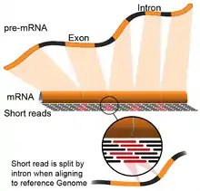 - دليل الجينوم: تعتمد هذه الطريقة على نفس الأساليب المستخدمة لمحاذاة الحمض النووي، مع التعقيد الإضافي المتمثل في محاذاة القراءات التي تغطي أجزاء غير مستمرة من الجينوم المرجعي. [55] هذه القراءات غير المستمرة هي نتيجة لتسلسل النصوص المقسمة (انظر الشكل). عادة، تحتوي خوارزميات المحاذاة على خطوتين: 1) محاذاة أجزاء قصيرة من القراءة (أي، بداية الجينوم) ، و 2) استخدام البرمجة الديناميكية لإيجاد محاذاة مثالية، وأحيانًا بالاقتران مع تعليقات توضيحية معروفة. تشمل أدوات البرمجيات التي تستخدم المحاذاة الموجهة للجينوم Bowtie ، [56] TopHat (الذي يبني على نتائج BowTie لمحاذاة الوصلات الفاصلة) ، [57] [58] Subread ، [59] STAR ، HISAT2 ، [60] Sailfish ، [61] كاليستو، [62] و GMAP. [63] يمكن قياس جودة التجميع الموجه للجينوم بمقاييس التجميع 1) de novo (على سبيل المثال، N50) و 2) مقارنات بالتسلسلات المعروفة، تقاطع الوصلات، الجينوم، والبروتين باستخدام الدقة ، الاستعادة ، أو توليفها (على سبيل المثال، النتيجة F1). [54] بالإضافة إلى ذلك، يمكن إجراء تقييم السيليكو باستخدام قراءات محاكية. [64] [65]