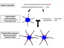 - اختيار / نضوب الحمض النووي الريبي: لتحليل إشارات الاهتمام، يمكن إما الاحتفاظ بالحمض النووي الريبي المعزول كما هو، مع ترشيح الحمض النووي الريبي مع ذيول متعددة الأقطاب (3) متعددة (poly (A) لتشمل فقط rRNA، المستخلص من الحمض النووي (rRNA)، و / أو تمت تصفيته من أجل الحمض النووي الريبي (RNA) الذي يربط تسلسلات محددة (جدول اختيار ونضج الحمض النووي الريبي، أسفل). الحمض النووي الريبي مع ذيول 3 '(بولي) الناضجة، والمعالجة، والتابعة لتسلسل الترميز. يتم اختيار (Poly A) عن طريق مزج الحمض النووي الريبي (RNA) مع قلة قليلة من القسيمات (T) المرتبطة تساهميًا بالركيزة، الخرز المغناطيسي عادة. [10] [11] يتجاهل اختيار (Poly A) الحمض النووي الريبي غير المشفر ويقدم تحيزًا 3 '، [12] والذي يتم تجنبه باستراتيجية نضوب الريبوسوم. تتم إزالة rRNA لأنه يمثل أكثر من 90 ٪ من الحمض النووي الريبي في الخلية، والتي إذا تم الاحتفاظ بها سوف تتخلص من البيانات الأخرى.