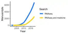 تم تطوير RNA-Seq لأول مرة في منتصف عام 2000 مع ظهور تقنية التسلسل من الجيل التالي. [121] تتضمن المخطوطات الأولى التي استخدمت RNA-Seq حتى بدون استخدام المصطلح تلك الخاصة بخطوط خلايا سرطان البروستاتا [122] (بتاريخ 2006) ، و Medicago truncatula [123] (2006) ، والذرة [124] (2007) ، و Arabidopsis thaliana [125] (2007) ، في حين أن مصطلح "RNA-Seq" نفسه ذكر لأول مرة في عام 2008. [126] يزداد عدد المخطوطات التي تشير إلى RNA-Seq في العنوان أو الملخص (الشكل ، الخط الأزرق) بشكل مستمر مع 6754 مخطوطة نشرت في عام 2018 ( رابط للبحث في PubMed ). تقاطع RNA-Seq والدواء (الشكل ، الخط الذهبي ، رابط البحث في النشرات الطبية PubMed ) له مرونة مماثلة.