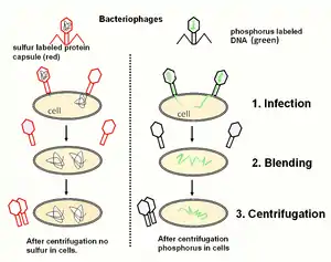 - Hershey A, Chase M; Chase (1952). "Independent functions of viral protein and nucleic acid in growth of bacteriophage" (PDF). J Gen Physiol. 36 (1): 39–56. doi:10.1085/jgp.36.1.39. PMC 2147348. PMID 12981234. مؤرشف من الأصل (PDF) في 1 أكتوبر 2008. الوسيط