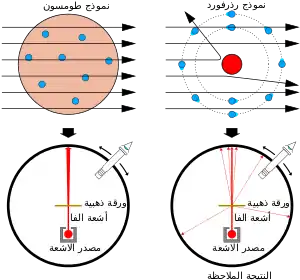 المشاهدة شاهد رذرفورد أن - معظم جسيمات ألفا نفذت دون أن تعاني أي انحراف، ونسبة قليلة جداً من جسيمات ألفا لم تنفذ من صفيحة الذهب وارتدت عكس مسارها، ووجد أن نسبة ضئيلة جداً من جسيمات ألفا نفذت خلال صفيحة الذهب ثم انحرفت عن مسارها.