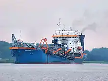 - عبارة عن سفينة تجريف رمال تعمل على مضخة، كما يوجد على ظهر السفينة حاوية (لتجميع الطمي) حيث تقوم بتجميع الرمل في ذات السفينة.