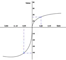 رسم بياني للقيمة المدركة للربح أو الخسارة مقابل القيمة العددية الصارمة للربح أو الخسارة. لاحظ أن الخسارة البالغة 0.05 دولار تعتبر خسارة أكبر بكثير من الخسارة المماثلة التي تبلغ 0.05 دولار.