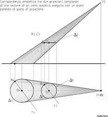 وعندما تكون الاشكال المتقابلة متشابهة كما في المثال المرفق، تسمى العلاقة التقابلية تحاكي . التي تتميز بكون محور التقابل خط لانهائي، وهذا يعني ان الخطوط المتقابلة مثل A-B ، A'B تكون متوازية لبعضها البعض. على سبيل المثال وبعد الانتهاء من تحديد الشكل الملون بالأصفر، وبهدف تحديد الشكل المقابل له (الملون بالأخضر) ، نقوم بتعيين زوجين من النقاط المتقابلة، مثل A ، A 'و B ، B' .. ومن ثم نشرع بتحديد مركز التقابل U كنقطة تقاطع بين الخطوط التي تمر بتلك النقاط . مثلا لتحديد النقطة C'، نقوم بتوصيلها مع نقطة B معلومة النقطة المقابلة لها B'. وهكذا نحصل على الخط r'. الخط r' المقابل للخط r يمر بالنقطة B' ويكون ايضا موازي للخط r. وأخيرا نحدد النقطة المطلوبة B' كتقاطع بين r' والخط U-B وبطريقة مماثلة للخطوات السابقة من الممكن تحديد جميع نقاط الشكل الأخضر