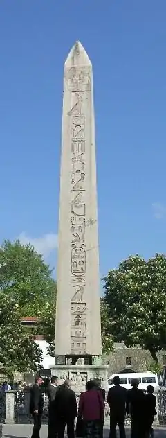 ومن الجدير بالذكر ان هذه المسلة قد أصيبت بخدوش من شظايا القنابل أثناء الحرب العالمية الثانية على نهر التيمز والمعروفة باسم إبرة كليوباترا والتي كان تحتمس قد أقامها أمام معبد عين شمس، ومسلة أخرى موجودة حاليا في إسطنبول هي إحدى مسلتين أقامهما تحتمس أمام الصرح السابع (بوابة عظيمة) بمعبد الكرنك وقد نقلها الأمبراطور ثيودورس عام 510 م، وفي الواقع تمثل هذه المسلة الجزء الأعلى فقط من مسلة كانت في الأصل أطول بكثير من أية مسلة موجودة الآن.