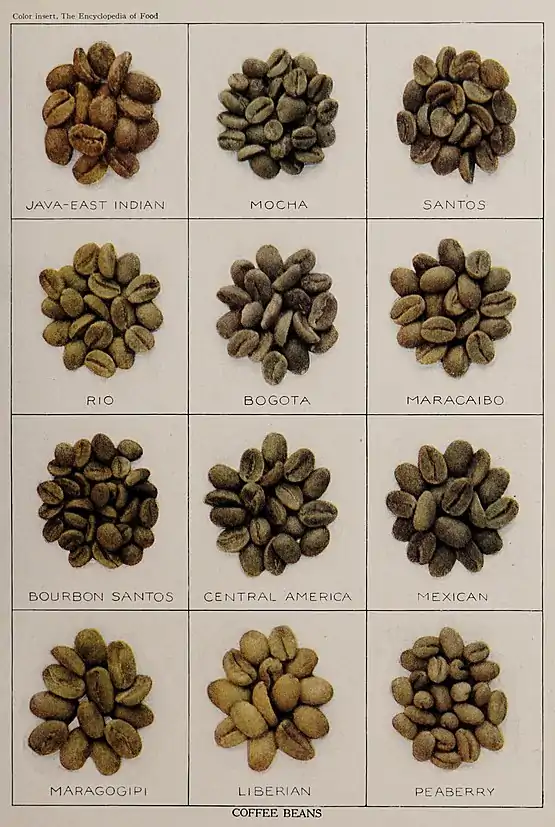 تتضمن القهوة حبوب البن / بذورة لثمار قرمزية التي يزال منها الغلاف الشمري الخارجي بالكامل، أما الغلاف الفضي الغلاف المنوي ) فيزال أحيانا .وقد تكون البذور عامة أو محمصة أو كاملة أو مطحونة، ويجب أن تكون من الجنس النباتي Coffea. يعرف الشراب المحضر من مثل هذه البذور قهوة أيضا. تعد أفريقيا ( إثيوبيا ) موطن القهوة، ومن هناك وصلت إلى بلاد العرب، ثم القسطنطينية وفينيسيا البندقية. بغض النظر عن منع استخدام القهوة والتحذيرات الطبية منها، انتشرت القهوة في منتصف القرن السابع عشر في جميع أنحاء أوروبا. شجرة البن أو شجيرة البن تعود إلى العائلة فويات Rabiaceae. ويمكن اعتمادا على النوع أن تنمو السابقة لارتفاع 3-12 مترا. شد الشجيرات لإبقائها على ارتفاع 2-2.5 مترا لتسهيل عملية الحصاد. تمتلك هذه الشجيرات دائمة الخضرة أوراق ذات ساق قصيرة ومتينة وأزهار بيضاء اللون معطرة شبيهة بالياسمين تعطي فاكهة بنواة صلدة توتية شبيهة بالكرز تطور لقطر حوالي 1.5 سم. ينقلب عندما تنضج الثمار أو التوتات لون غلافها الخارجي من الأخضر إلى الأحمر البنفسجي أو الأحمر الداكن وبحصر بداخله لب الثمرة الحلو أو اللب ونواة الفاكهة الصلدة .تتضمن هذه الأخيرة نصفي كرة اهليليجيين مع أضلاع محاورة مسطحة. الغلاف المنوي أو الغلاف الفضي المصفر الشفاف يغطي كل نصف كرة. ويغطي نصفي الكرتين ويفصلهما عن بعضهما الآخر غلاف الثمرة الداخلي الليفي القوي الذي يسمى " الصفيحة ". في بعض الأحيان، 10-15% من الفاكهة التوتية تحوي حبة كروية واحدة فقط تدعى ( " peaberry " or caracol ) وغالبا ما تجلب سعرا حافزا.