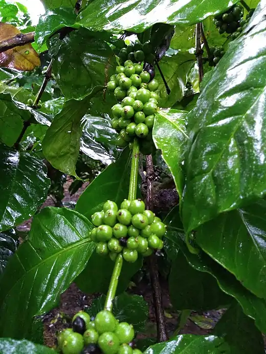 C. liberica وأنواع أخرى أقل من 1%. أن الكمية ( بالكغ ) من ثمار القهوة الطازجة التي تنتج ا كغ من حبات القهوة الرائجة بالنسبة ل C , arabica هو 6.38 و بالنسبة ل C. camephora هو 4.35 وبالنسبة ل C. liberica هو 11.5.[1]