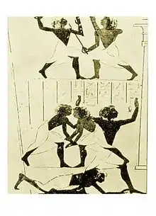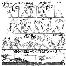 - W. ديكر، الرياضة والألعاب في مصر القديمة، ييل، 1992، ص. 83، رر. 52 ؛ ج.أ.ويلسون، "الألعاب الاحتفالية للمملكة الحديثة"، JEA 17 (1931)، ص. 211-220